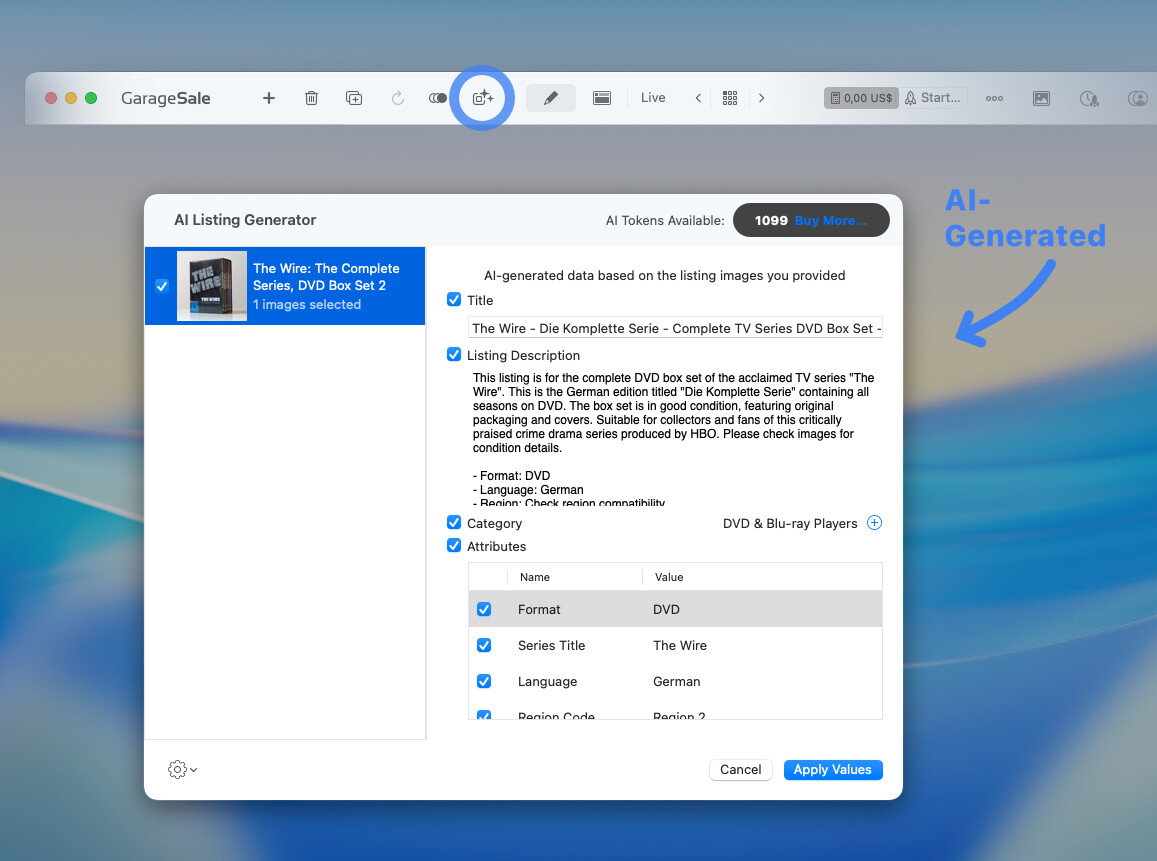 a new AI Listing Generator will generate listing descriptions and attributes, and pick categories from your item images (may require additional purchase of image tokens