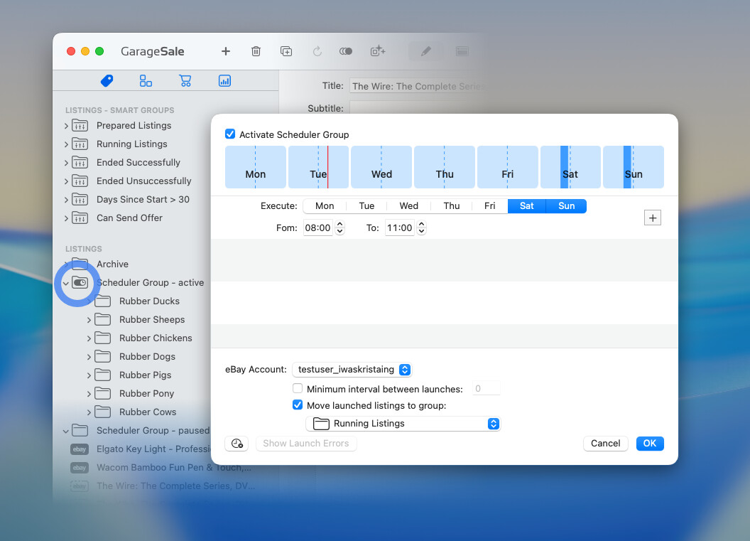 Each minute, GarageSale will try to upload unscheduled listings in your scheduled groups, if the scheduled group has a time window matching the current time