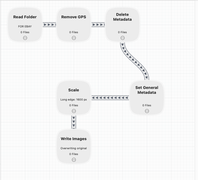 I select the images for a listing from Photos - drag them to a folder; let “magic” happen, and then drag the images from a different folder into GS. I keep a Finder window open with a folder called “For eBay” and in that folder is just one other folder called PostFlight, which remains empty. When I drag the images into For eBay, Hazel runs a Retrobatch Workflow that removes EXIF [GPS, etc] data, resizes the images to fit within 1600x1600, then overwrites the original image. Hazel then runs JPEGmini Pro on the images, overwriting them, and moves them to PostFlight. [EDIT: actually Hazel moves them, then runs JPEGmini Pro].