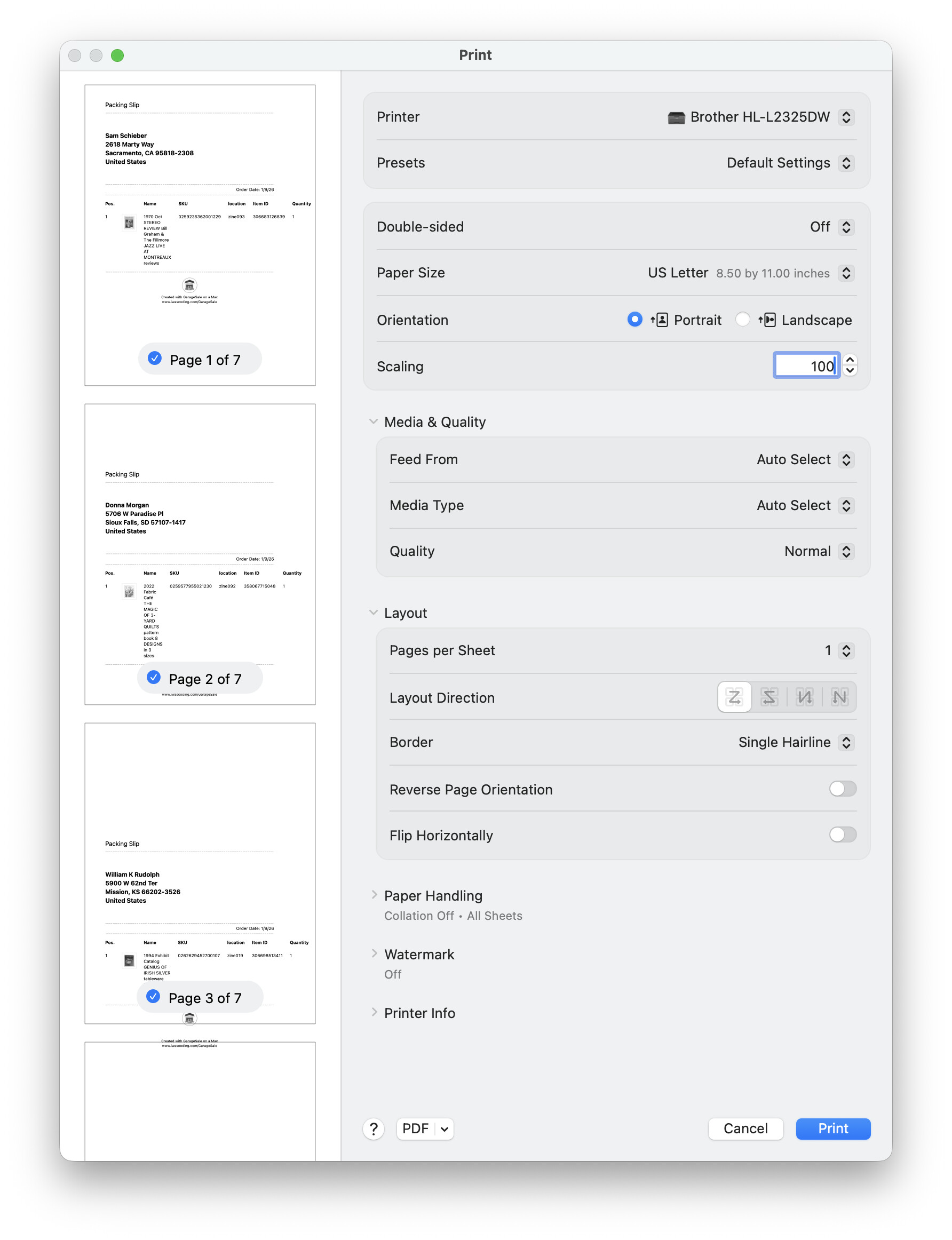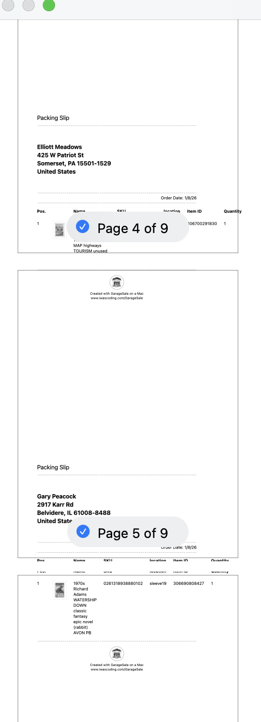 I added hairline borders to show the page margins. You can see in the thumbnails before they are printed that the notional “top” of the packing slip pages is out of phase with the pages themselves.