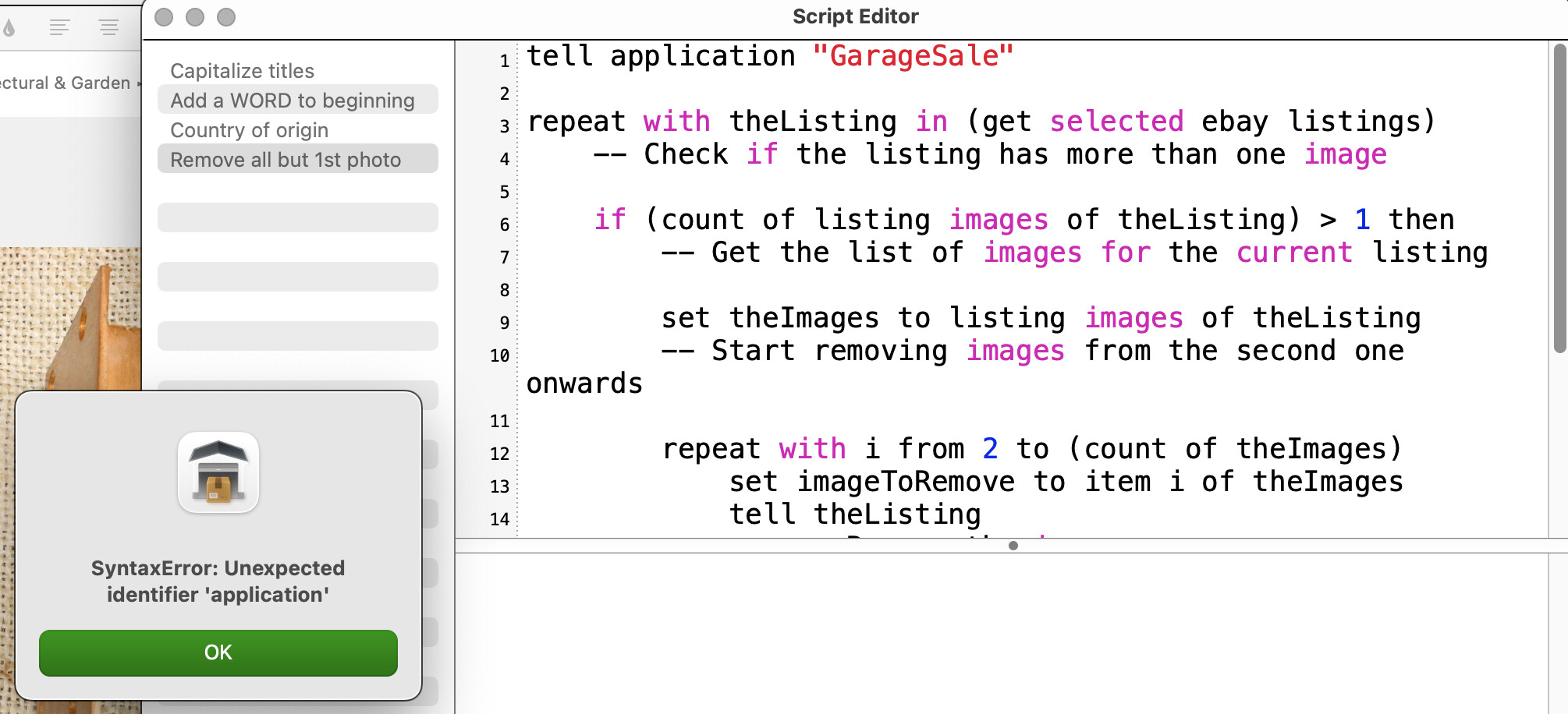 I tried it and got a syntax error. What did I do wrong? I also put the exact “GarageSale 9.9.5b5” name in and got the same result. I asked GROK to fix it and got the same result after changes.