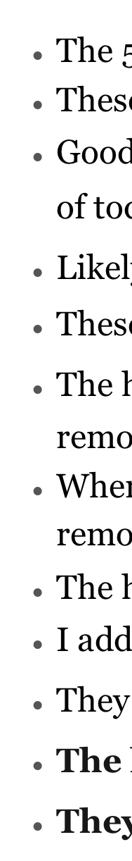 For me, I never use formatted text as my source. Everything is done in Drafts - which deals with straight text, no bold, italics, HTML formatting, etc. My templates are 100% clean as they have “replace this text” as actual text in the body of each listing. If I go into HTML mode in GS, I can see there’s no stray CSS/html - nothing but the “replace this text” which I select all to, then paste into. Pasting into that area is 100% unformatted plain text. I highlight my list, command-B it [to bold it], then, while it is still highlighted, I select the bulleted list icon from the toolbar. I should make a custom keyboard shortcut for that. 100% of the time, it results in exactly the correct format. It’s when time goes by - minutes, hours, the next day, that suddenly the list becomes as the 2017 post shows.
