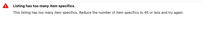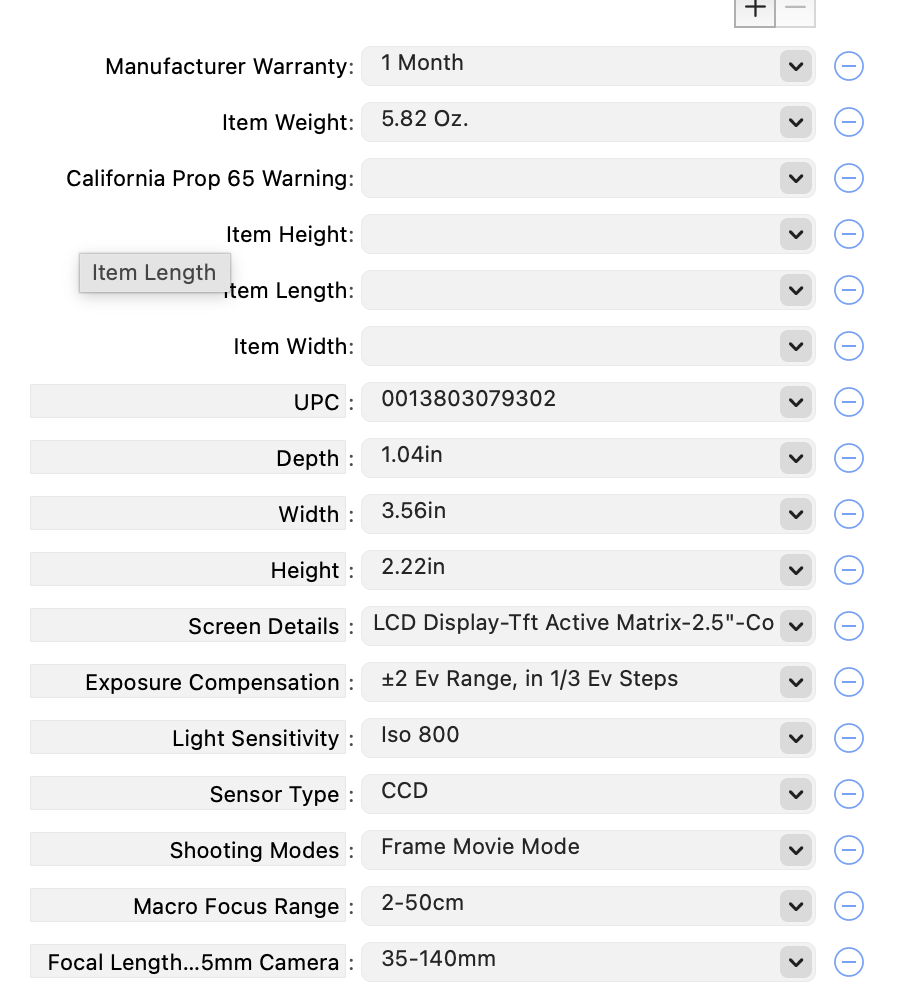 For me that fetches 64 attributes! But if I try to sell this, I get an error from eBay stating I can only have a maximum of 45 attributes. So now I have to randomly delete a bunch of them. If one is selling a lot of cameras [and I recently have a bulk buy of several, so this is gonna be a pain], this is a pain. How/why does GS fetch more data than is allowed to send back to eBay? How can this be fixed without having to do so much mouse/trackpad clicking? Thanks.