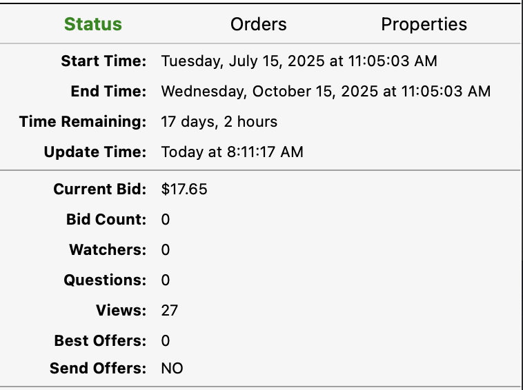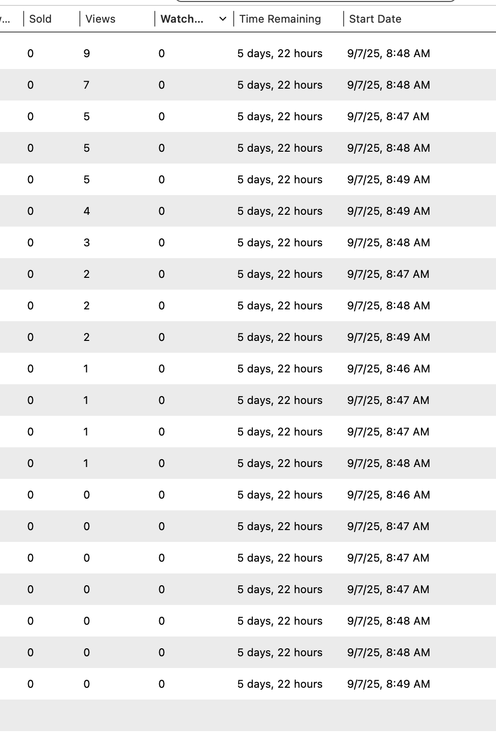 When do the bots start viewing and watching? Here is a sample of 30 listings and after 25 days and only 21 have come back with no watchers (9 got 2 or more watchers). Seven even have had no views. This is a reoccurring pattern that deviates some depending on the items listed.