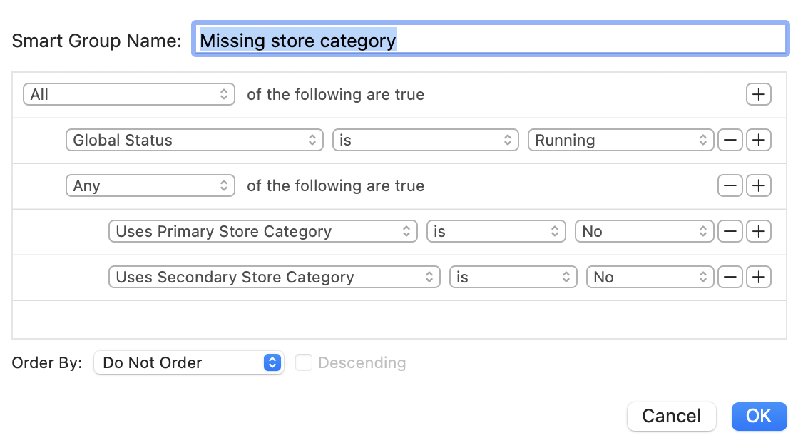 I thought maybe I could simply build a Smart Folder to search for things that were broken in this way, but no! Apparently the listings where this happened do have a Store Category set, it’s just not a valid one by number (not a leaf of the new tree). And I also cannot search for listings with the old Store Category set, because the Smart Folder filter Primary Store Category is… won’t show something that isn’t on the tree either.