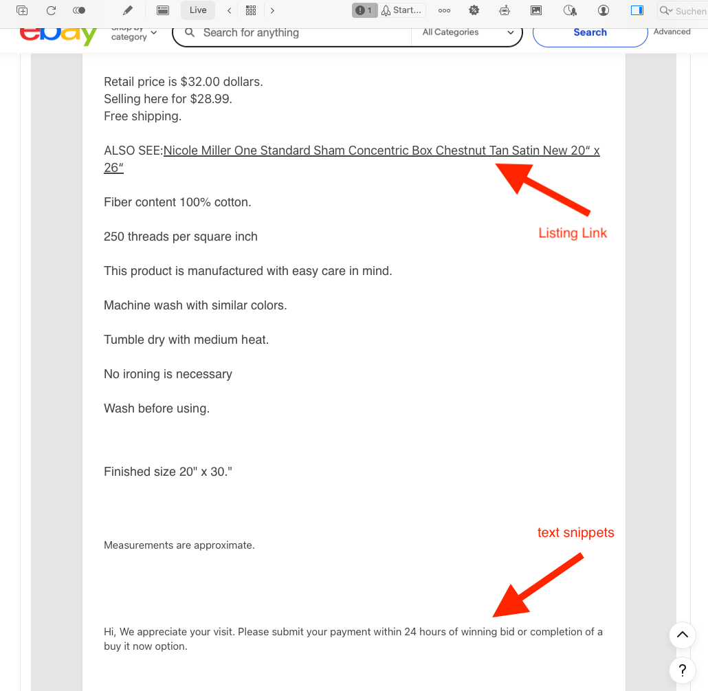 Yes, sending now. This is a listing of which the Insert Link to Listing appears ok INSIDE the APP, both in preview and Live mode, but does not show up in the revision sent to eBay, at least on my end. Again, this is hit or miss, as sometimes I have an issue, and sometimes all is good, not sure if it’s an HTML code thing or a template thing. The weird thing on this one is that the link shows up on my iPhone in the live but not on my Mac browser.